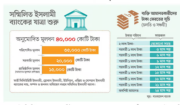 বাংলাদেশ ব্যাংক গতকাল মঙ্গলবার প্রজ্ঞাপন জারি করে নতুন ব্যাংক গঠনের স্কিম সম্পর্কে বিস্তারিত জানিয়েছে। এতে নতুন ব্যাংকের মূলধন ও পাঁচ ব্যাংকে থাকা প্রাতিষ্ঠানিক আমানতকারীদের ভবিষ্যৎ স্পষ্ট করা হয়েছে।
